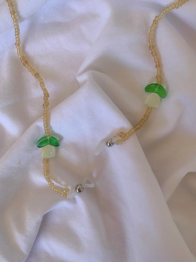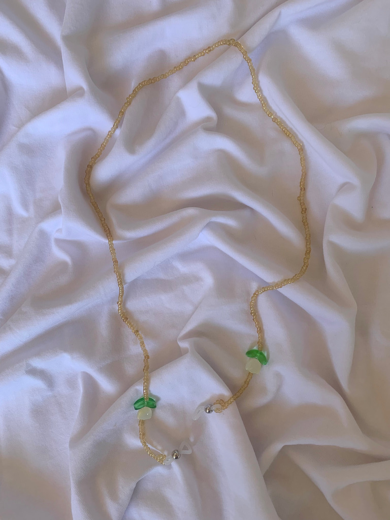 Cette création est réalisée en perles de verre et acryliques montées sur du fil de pêche et des maintiens en caoutchouc.