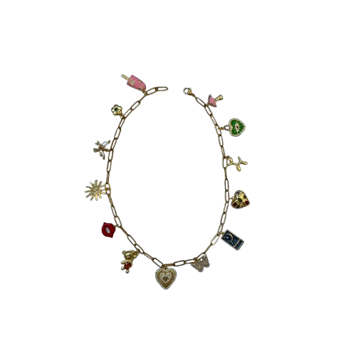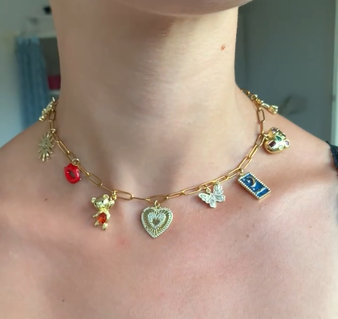 Cette création est réalisée avec des breloques d’acier inxoydable montées sur une chaîne couleur or en acier inoxydable. Le mousqueton permet un ajustement de la taille si nécessaire.